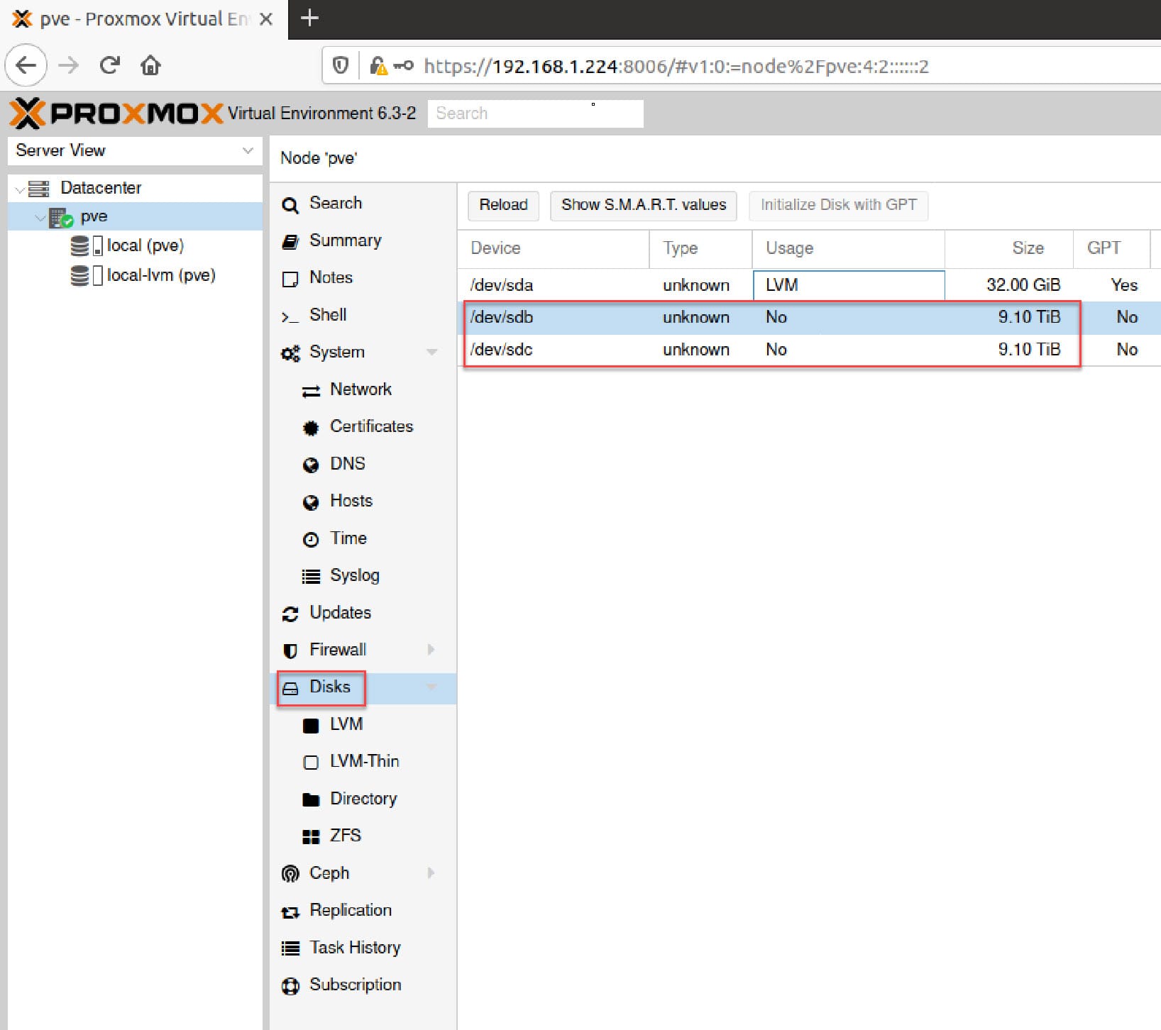First, check that Proxmox sees your disks. In the Proxmox web UI, navigate to your node → Disks.