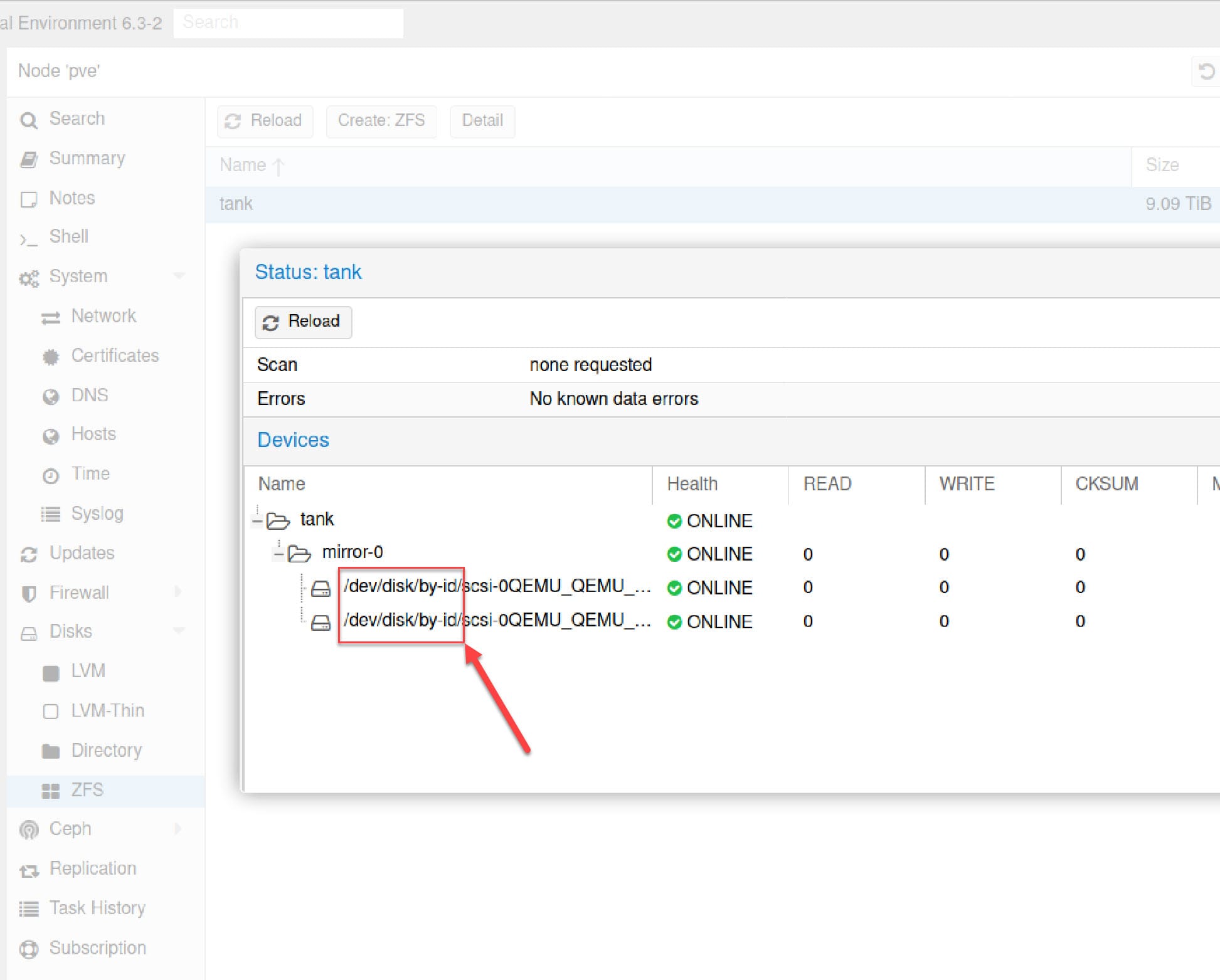 In Proxmox web UI, go to Disks → ZFS, select your pool tank, and click Detail. You should now see /dev/disk/by-id/ paths instead of /dev/sdb.